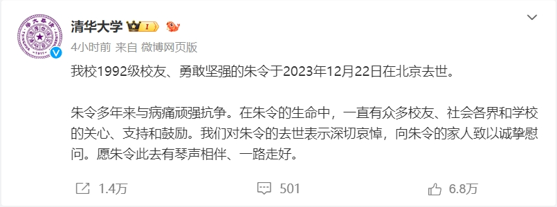 清華表示,朱令多年來與病痛頑強抗爭。在朱令的生命中,一直有眾多校友、社會各界和學(xué)校的關(guān)心、支持和鼓勵。“我們對朱令的去世表示深切哀悼,向朱令的家人致以誠摯慰問。愿朱令此去有琴聲相伴、一路走好。”