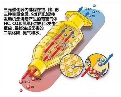 大部分汽車中都有一個配件——三元催化器,它能減少諸如一氧化碳、碳氫化合物和氮氧化合物等有害氣體的排放,是汽車中一個比較重要的組成部分。轉換器中的某些化學反應會將有害物質轉換為二氧化碳、水和氮。