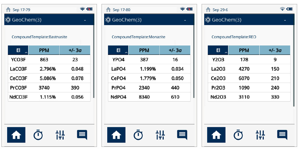 雖然稀土元素在技術上并不“稀有”,但它們通常不會像金(Au)或其他礦物那樣以高含量的礦脈形式存在。因此對稀土礦石的識別和開采非常困難。此外,稀土礦石的加工是一項較為獨特、主要是化學工程的任務,遠比加工金和賤金屬礦石復雜。Vanta手持式XRF光譜儀可以檢測低至兩位數ppm水平的稀土金屬,是在現場快速識別這些寶貴元素的理想工具。此外,Vanta光譜儀可以在野外計算稀土氧化物的含量,如下圖所示。圖2.