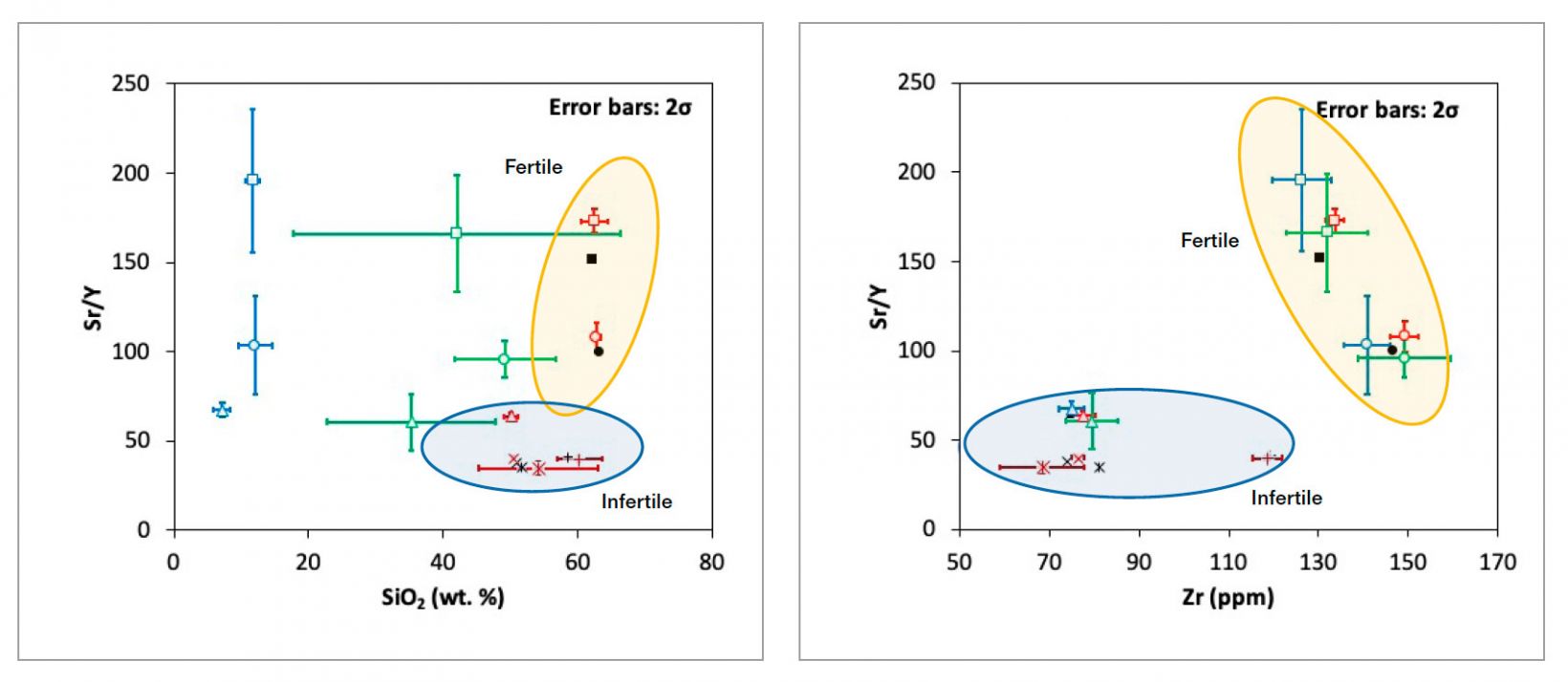 (a) Sr/Y對(duì)比SiO2的判別圖表,通常用作可開(kāi)采潛力指示。
