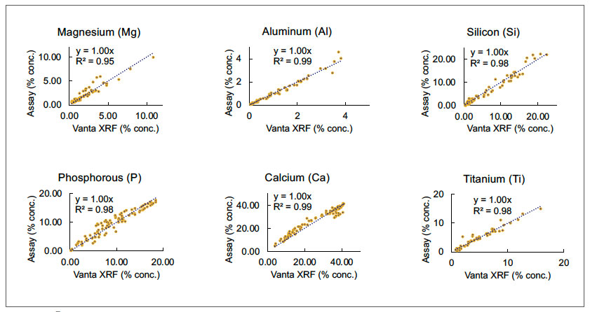 上圖中的數(shù)據(jù)表明Vanta手持式XRF光譜儀在檢測一系列從客戶采集的真實樣品制成的參考材料時所表現(xiàn)的開箱即用性。參考數(shù)據(jù)與Vanta手持式XRF光譜儀獲得的結(jié)果高度吻合,表明Vanta XRF元素分析儀在檢測從各種磷酸鹽巖材料制備的樣品時,可以提供優(yōu)質(zhì)數(shù)據(jù)。這些樣品的檢測時間平均不到一分鐘,樣品的制備也非常簡單。樣品制備工作包括快速手工粉碎或研磨樣品,使其顆粒小于0.2毫米,然后再將其收集到標(biāo)準(zhǔn)樣品杯中。