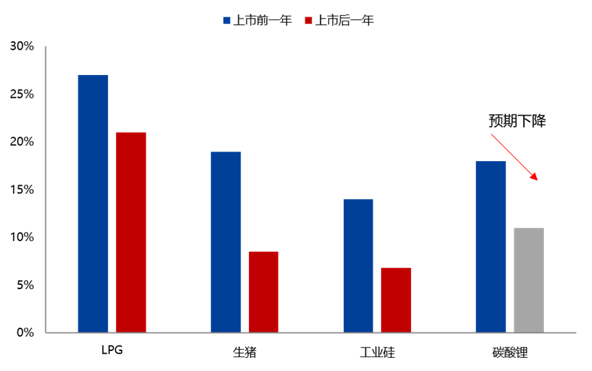 據(jù)相期貨公司預(yù)測(cè),參考最近三年新增的品種LPG、生豬和工業(yè)硅,上市后歷史波動(dòng)率均值較之前明顯下降。最近一年電池級(jí)碳酸鋰歷史波動(dòng)率均值為18%,期貨上市后預(yù)計(jì)逐步下降至11%左右。