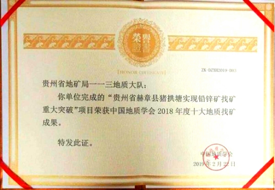 豬拱塘鉛鋅礦是地質找礦新機制“商業跟進”的又一成功范例,其重大找礦成果被業界高度認可,先后榮獲中國地質學會頒發“2018年度十大地質找礦成果獎”、第七屆“中國有色金屬地質找礦成果獎”一等獎。