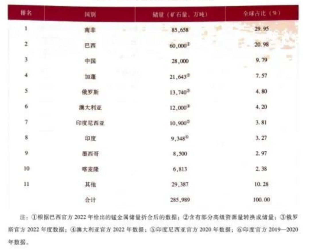 錳礦,是一種非常重要的戰略礦產資源,尤其是富錳礦和優質錳礦資源,已經被中國列入到緊缺的礦種。錳及其化合物應用于國民經濟的各個領域,每輛特斯拉Model 3需要6.8公斤錳,而比亞迪刀片電池的磷酸錳鋰技術對高純度錳需求激增,錳已成為鋼鐵、新能源、新材料等產業的基本原料。從儲量分布來看,根據中國地調局發布的《全球礦產資源儲量評估報告2024》顯示,全球錳儲量28.6億噸(礦石量,下同),主要分布在南非(29.95%)、巴西(20.98%)、中國(9.79%)和加蓬(7.57%)等國,俄羅斯、澳大利亞、印度尼西亞、印度、墨西哥和喀麥隆等國家也有少量分布。