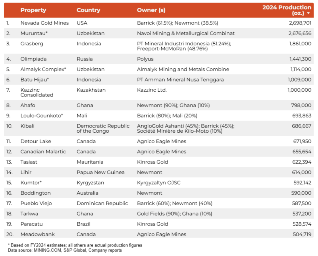 根據(jù)實(shí)際或估計(jì)的產(chǎn)量,外媒mining.com對2024年前20名黃金生產(chǎn)業(yè)務(wù)進(jìn)行排名。位于美國內(nèi)華達(dá)州的內(nèi)華達(dá)金礦(Nevada Gold Mines,簡稱NGM)2024年生產(chǎn)269.87萬盎司黃金(約84噸),是全球最大的金礦綜合體。該綜合體自加拿大黃金巨頭巴里克黃金放棄對美國競爭對手紐蒙特的敵意收購后,雙方創(chuàng)建的合資公司,將兩家公司在內(nèi)華達(dá)州的資產(chǎn)合并在一起。目前,該金礦綜合體包括10個地下礦山和12個露天礦組成,巴里克黃金(Barrick Gold)持股61.5%,紐蒙特(Newmont)持股38.5%。