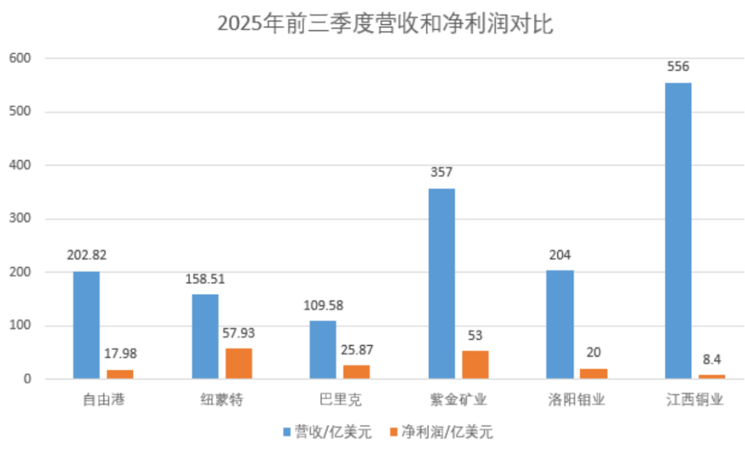 國際礦業巨頭,全球最大金礦商紐蒙特(Newmont) 2025年前三季度季度銷售額158.51億美元,季度歸屬公司股東的凈利潤57.93億美元;巴里克公司 2025年前三季度季度銷售額109.58億美元,季度歸屬公司股東的凈利潤25.87億美元;美國自由港邁克墨倫銅金礦(Freeport-McMoRan Inc.) 2025年前三季度營收202.82億美元,季度歸屬普通股東的凈利潤17.98億美元。