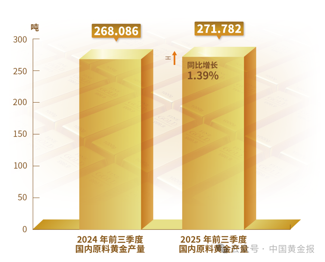 黃金生產 據中國黃金協會最新統計數據顯示:2025年前三季度,國內原料產金271.782噸,比2024年同期增加3.714噸,同比增長1.39%。另有進口原料產金121.149噸,同比增長8.94%。國內原料和進口原料共計生產黃金392.931噸,同比增長3.6%。