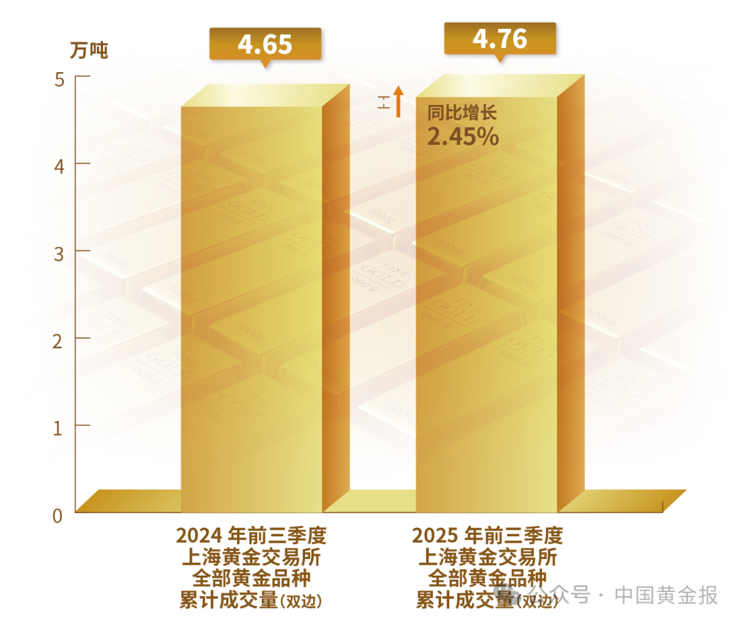 不同品類黃金產品的表現差異明顯。輕克重、附加值高的首飾產品仍保持較強市場吸引力,銷售情況較好。金條需求仍然旺盛,地緣沖突加劇與經濟不確定性使得黃金避險保值的功能進一步凸顯。電子、新能源等產業的快速發展使得工業用金需求穩步回升。 黃金市場 2025年前三季度,上海黃金交易所全部黃金品種累計成交量單邊2.38萬噸(雙邊4.76萬噸),同比上升2.45%;累計成交額單邊17.68萬億元(雙邊35.35萬億元),同比上升41.55%。上海期貨交易所全部黃金期貨期權累計成交量單邊10.36萬噸(雙邊20.72萬噸),同比上升59.98%;累計成交額單邊61.08萬億元(雙邊122.15萬億元),同比上升112.6%。