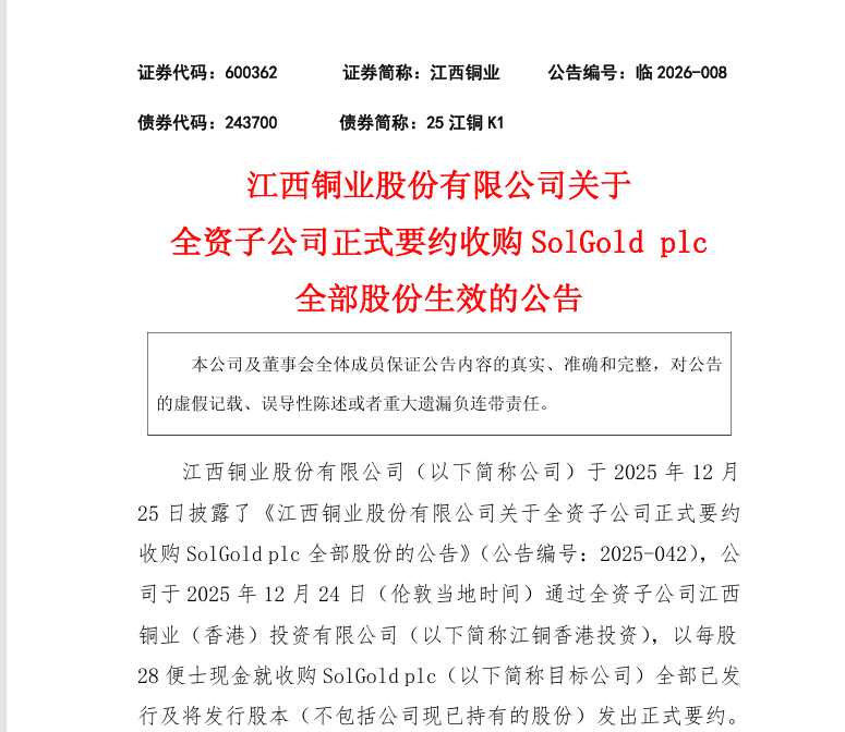 這場備受行業(yè)關注的跨境并購,始于2025年12月,前后歷時3個月,期間波折不斷。江銅最初通過全資子公司江西銅業(yè)(香港)投資有限公司發(fā)起收購要約,先后兩次以每股26便士的價格報價,均被SolGold董事會拒絕,收購進程一度陷入停滯。